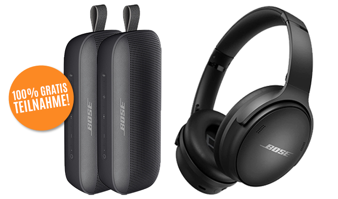 Bitte gib auf der nächsten Seite deine Gewinndaten ein und gewinne dein Bose Sound Duo bestehend aus Bose QuietComfort Kopfhörern und dem Bose Flex Lautsprecher.